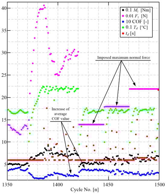 It has been noticed that the COF drops (Figure 14, blue dots) correlate with instances in which the cooling delay is set to zero (Figure 14, red dots). It is hypothesized that running the high-power closing cycles without any cooling delay (typically during the long warm up periods) results in non-uniform temperature distribution in the friction surface, i.e., the appearance of hot spots that can cause local fading-like effects. The temperature distribution becomes more uniform once the cooling delay is applied upon achieving the target temperature, thus, resulting in the restoration of COF (see the response sections immediately after n = 0 and n = 200 in Figure 14).
