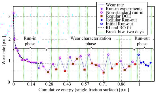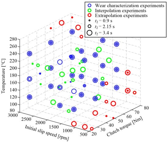 For each new friction plate involved in the tests, a run-in phase of experiments is first recorded for a single operating point (ω0 = 2800 rpm, Mz2 = 50 Nm, t2 = 3.4 s, TdR = 170 °C). In this phase, the wear rate stabilizes from the initially high values (see filled magenta points in Figure 17 and [17]). Once the friction lining is close to being worn out, a set of run-out experiments (blue circles in Figure 17) is recorded for the same operating point as with the run-in experiments. The run-out results are used to compensate for the friction plate piece-to-piece wear-rate variation [17]. The wear characterization experiments were recorded between the run-in and run-out phases (red squares in Figure 17). In total, 14 friction plates were worn out to record all 121 experiments denoted in Figure 16.