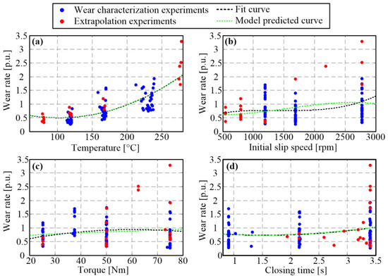 Figure 18 shows the 1D plots correlating to the wear rate and the individual model inputs for characterization (red) and extrapolation points (blue; 101 points in total). The same plots show the low-order polynomial fit lines (dashed black lines). Evidently, the clutch interface temperature has the most dominant influence on the wear rate (Figure 18a), which is captured by the standard wear model (1). The second most-influential input is the initial slip speed (Figure 18b). Although the plots with respect to two remaining inputs (clutch torque and closing time; Figure 18c,d) appear to be relatively flat, these inputs may have considerable influence to wear rate when combined with another parameter (i.e., when a multi-dimensional plot is considered, Section 6.3).
