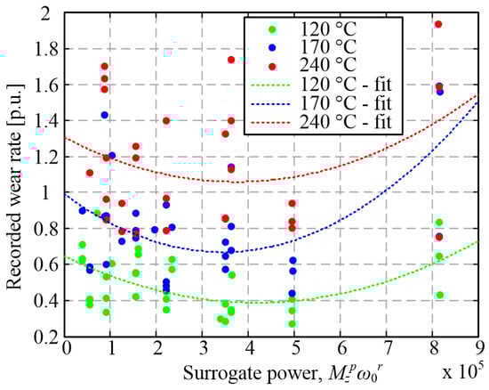 Figure 19 shows the wear rate plots in the dependence of surrogate dissipated power Mz22ω0 for different temperatures. The wear rate points group well around the interpolation curves (particularly for low wear rates, i.e., low temperatures), thus, meaning that the surrogate power may be used as a lumped model input instead of two individual inputs. This reduces the model dimensionality from four to three inputs and allows for the use of the ultimate best subset method of cubic model parameterization (Section 6.3).