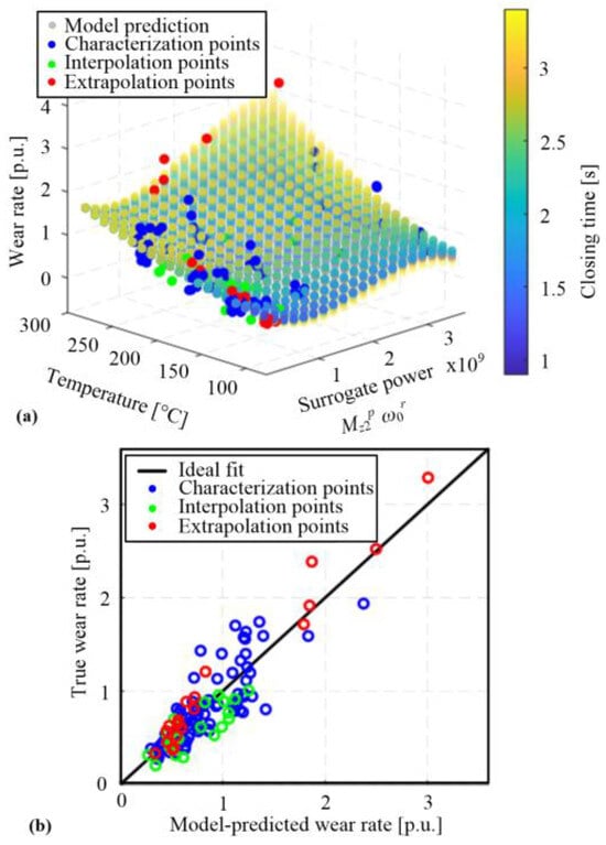 The model response surface is shown in Figure 20a together with the individual, recorded wear-rate points. The response surface confirms the dominant influence of temperature, the second-dominant influence of surrogate power (connected with the initial slip speed influence in Figure 18), and the least, but still considerable, influence of closing time. The 2D plot of true vs. model-predicted wear rate, shown in Figure 20b, confirms a good modeling accuracy not only for categorization and extrapolation points used for model training but also for unseen interpolation points. The modeling accuracy is better, i.e., the wear-rate process uncertainty is lower for lower wear rates (e.g., lower temperatures), which agrees with the preliminary results shown in Figure 19. The good modeling accuracy is reflected in a very good alignment of the fit (black) and model-predicted (green) lines in Figure 18.