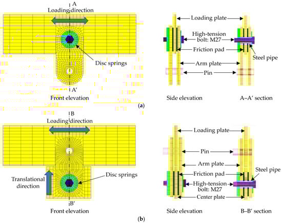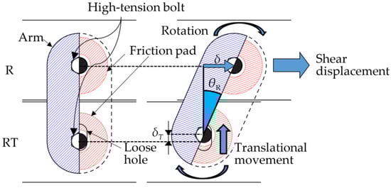 The rotational friction damper, as proposed in our study, can be installed at the terminations of a brace within a building frame, illustrated in Figure 1. Figure 2 depicts a single unit of this damper along with its corresponding movement. Friction pads are positioned between the arm plate and the other plates and are subjected to surface pressure using high-tension bolts. The dynamics of the damper operation exhibit distinct characteristics: the upper side, referred to as ‘R’, experiences rotational forces exclusively, while the lower side, labeled ‘RT’, undergoes both rotational and translational movements, as demonstrated in Figure 2. Both ‘R’ and ‘RT’ function as friction dampers, obviating the necessity for pin joints at their connections.