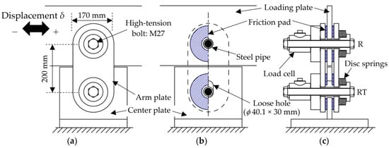 The application of friction dampers to building structures has been studied since the early 1980s []. Some incorporate a link mechanism in the brace, known as the Pall Friction Damper [,]. Additionally, an improved version of the Pall Friction Damper has been proposed to reduce manufacturing costs and enhance workability [,,,].