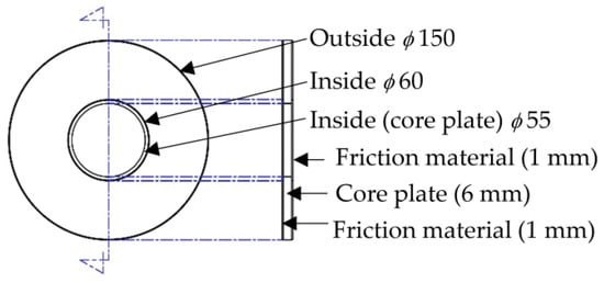 Figure 3 illustrates the specimen configuration of the rotational friction damper. Figure 3b provides an internal view of the specimen, showcasing the absence of the arm and disc spring components. Friction pads are positioned between the arm plate and the center or loading plates and are subjected to surface pressure using high-tension bolts. The arm, center, and loading plates in the test specimen were constructed from stainless steel (SUS304) due to its inherent abrasion resistance. The friction pad assembly comprises a core plate (6 mm) wedged between two layers of friction material (1 mm each), as depicted in Figure 4.