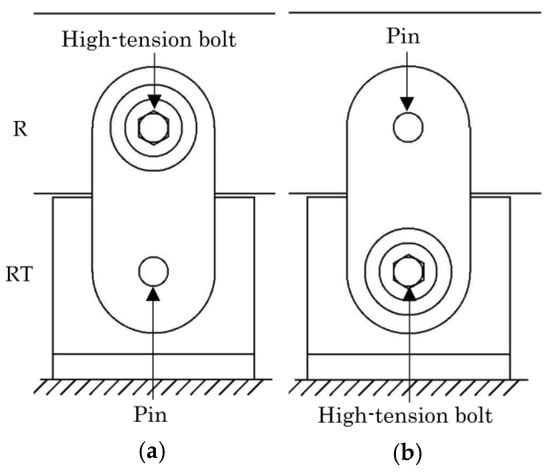 The proposed rotational friction damper comprises two distinct components: a rotational friction damper (R) and a rotational friction damper with translational movement (RT), detailed in Figure 2. To individually analyze the behavior of R and RT, separate experiments were carried out for specimen R and specimen RT in this study. Consequently, a pin joint was employed at the RT side for specimen R, and conversely, at the R side for specimen RT, as illustrated in Figure 5.