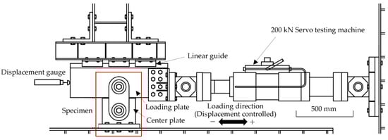 Figure 6 depicts the test setup of the specimen. Horizontal displacement was applied to the loading plate, which was dynamically executed via a 200 kN servo hydraulic testing machine. The input waveform followed a sine wave pattern. Measurement parameters encompassed load, displacement along the loading direction, bolt axial force (measured using a load cell), and friction pad temperature. To confine the vertical displacement of the plate during experiments, a linear guide was integrated onto the loading plate.