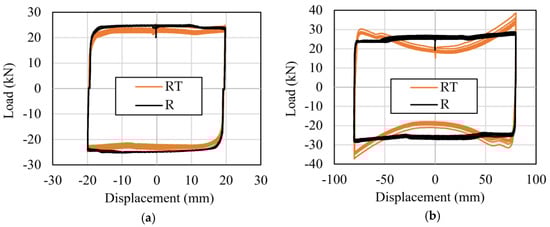 Figure 7 illustrates the load–displacement relationship derived from the experiments, with loading protocols No. 8 (amplitude ± 20 mm) and No. 12 (amplitude ± 80 mm) serving as examples for R and RT, respectively. For both R and RT in No. 8, typical rectangular hysteresis loops, characteristic of friction dampers, are observed. Conversely, in No. 12, distinctive hysteresis loops are evident between R and RT. RT displays higher loads correlating with increased displacement due to translational movement, whereas R maintains a rectangular hysteresis loop. This distinction represents a key characteristic of the proposed rotational friction damper with translational movement. It is noted that R exhibits higher loads compared to RT at 0 mm displacement, attributable to variations in the friction coefficient.