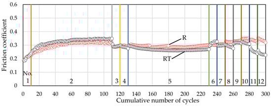 Figure 8 shows the relationship between the friction coefficient and the cumulative number of cycles for R and RT, respectively. The friction coefficient values are extracted at 0 mm displacement within each cycle. The numerical labels 1 to 12 along the horizontal axis correspond to the loading protocol numbers specified in Table 1. In both instances of R and RT, a trend emerges where the friction coefficient experiences an initial increase for No. 1 and No. 2, reaching a near-stable value after approximately 60 cycles. Beyond No. 3, both R and RT exhibit a consistent friction coefficient around 0.3, albeit with some scattered values.