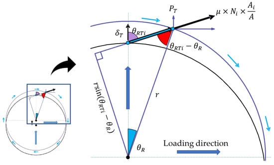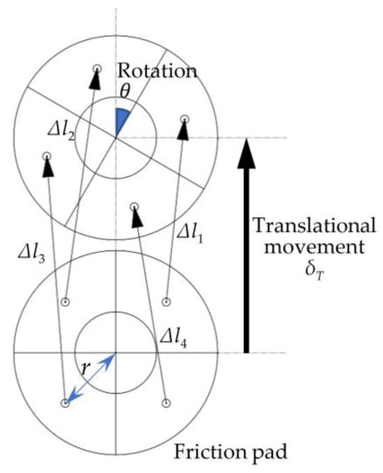Since rotation occurs simultaneously with translational movement as demonstrated in Figure 13, the rotational friction moment, MRT, accounting for translational movement, is calculated using Equation (7), where n represents the number of divisions of the friction pad. PRT_R is derived from the obtained rotational friction moment, MRT, utilizing Equation (8):