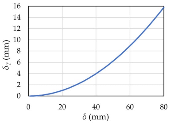 δT represents the vertical displacement, as depicted in Figure 2, where the initial span of 200 mm is reduced in accordance with δT. For reference, Figure 12 illustrates the correlation between δ and δT.