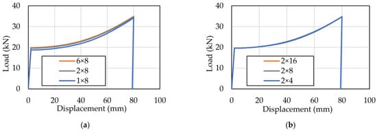 In Figure 14, the load–displacement curves are depicted to analyze the effects of segmentation on Model 1’s strength. Regarding the radial segmentations in Figure 14a, the 1 × 8 segmentation exhibits a slightly smaller load compared to the others, while both the 2 × 8 and 6 × 8 segmentations demonstrate almost identical behavior. This suggests that two segments in the circumferential direction suffice for effective segmentation. As for the circumferential segmentations illustrated in Figure 14b, Load-displacement relationships are almost exactly the same. Hence, it is evident that a 2 × 4 segmentation would be a reasonable choice for calculations.