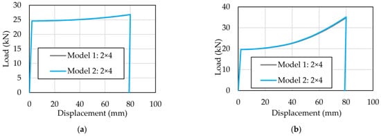 Figure 15 presents a comparative analysis of the strength estimation models for both R and RT, employing a 2 × 4 segmentation, as indicated in Figure 14. The load–displacement curves for Models 1 and 2 demonstrate close agreement in both R and RT scenarios. In R (a), the load remains relatively constant due to the consistent nature of the rotational friction moment. However, a slight increase in load is noticeable in R, attributed to the reduction in the distance (span) between the arm holes caused by translational movement, as depicted in Figure 2. In contrast, in RT (b), the load exhibits an increase corresponding to the displacement resulting from translational movement. Models 1 and 2 present nearly identical results across the range of observed displacements.
