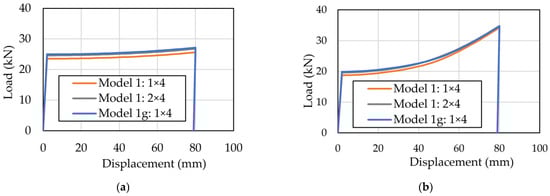 According to Figure 17, while the 1 × 4 segmentation of Model 1 exhibits a slightly lower load, the behavior of the 1 × 4 segmentation in Model 1 g closely resembles that of the 2 × 4 segmentation in Model 2 × 4. As a result, based on the insights from Figure 17, we intend to adopt Model 1 g (1 × 4 segmentation) as the primary strength estimation model for discussion purposes.