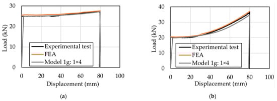For the validation of the strength estimation model (Model 1 g: 1 × 4 segmentation), the load–displacement curves of the model are compared against those derived from both experimental tests and Finite Element Analysis (FEA).