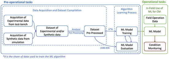 The approach behind data-driven CM is illustrated in Figure 1 []. In the pre-operational phase, the purpose is to configure a machine learning (ML) algorithm able to identify patterns within the data about the health state of the machinery and recognize them in the operational phase. The algorithm thus relies on data to effectively learn how to diagnose and prognosticate a fault in practice []. These data which are related to the health state of the machinery are collected experimentally from a test-bench, e.g., as in [,], and/or via physical/mathematical simulations, e.g., as in [,]. As such, a dataset is formed with these data which then are preprocessed before being fed into a learning algorithm. During the preprocessing stage, the data are analyzed and organized to enhance their quality and make them suitable for effective ML model training. As such, an optimized learning process can start, where the ML model is trained on a share of the dataset, and then performances are evaluated on the rest of the dataset. The learning process is dynamic, as the algorithm’s training is continuously evaluated in tandem with the model’s performance during the evaluation phase. Once high evaluation performances are achieved, the model is used to handle operational tasks, where the ML algorithm analyzes and processes field operation data for CM purposes.