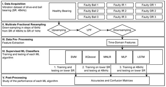 The methodology used to study the effect of the SF of vibration signals on the performance of ML algorithms is described in Figure 3. It is organized in five steps.