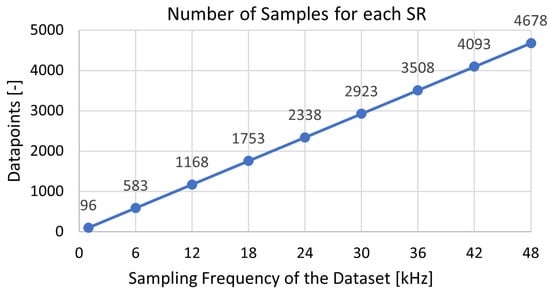 where T is the signal duration [s]. Therefore, when decimating a signal, as its is reduced according to (3) and needs to adhere to the Nyquist theorem to avoid aliasing, the number of samples in the decimated signal is effectively reduced. More precisely, high-frequency components are cut after fractional resampling if the new SR is lower than the initial SR []. This reduces the signal length and the number of samples available to train the ML algorithms. However, higher frequency components are often associated with noise and removing them might be beneficial to the training of the ML algorithm. Therefore, while canceling these noisy high frequency components, ML algorithms might suffer from a lack of data to properly learn the intrinsic patterns in a dataset [] and a trade-off should be sought between noise cancellation and the number of samples available.