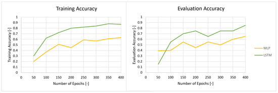 These steps show how an RNN processes sequential data with feedback between neurons, allowing it to model temporal dependencies. In the present paper, a specific type of RNN is considered, long short-term memory network (LSTM). A LSTM network provides a mechanism for maintaining short-term memory in the RNN by optimizing the retention of important context and dependencies over a substantial number of timesteps. It has demonstrated its efficacy in classifying vibration data for bearing fault diagnosis []. LSTM thus provides an interesting foundation to study the impact of data quality on an ANN, considering its performance with respect to MLP, i.e., an analysis of architectures of ANNs with and without recurrent connections.