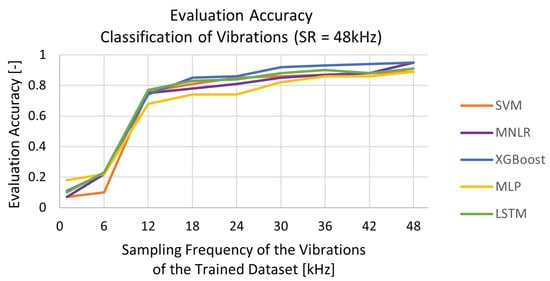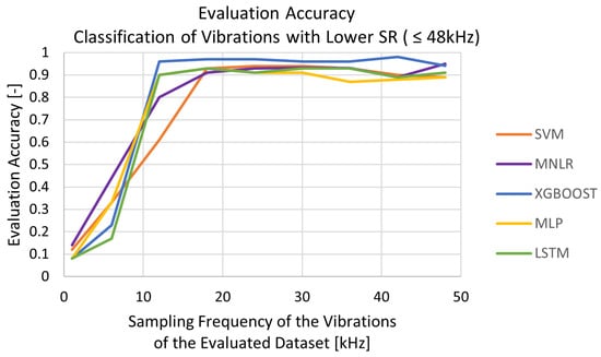 Evaluation accuracy of classifiers trained on vibration signals sampled at 48 kHz for classification of signals sampled from 1 to 48 kHz.
