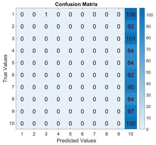 Based on this, MNLR enlarges the concept of logistic regression to multiple class classification by reusing the concept of cross-entropy loss but changing the predicted probability distribution. The workflow of the MNLR is constituted by three layers, including a linear model, but also by introducing a softmax layer for the multidimensionality of the data labels, before calculating the cross-entropy []. The softmax function transforms a vector of k real numbers into a probability distribution over k possible outcomes and, by consequence, introduces multi-dimensionality. This makes the method suitable for the classification of non-linear datasets, such as for vibration data. The softmax equation is