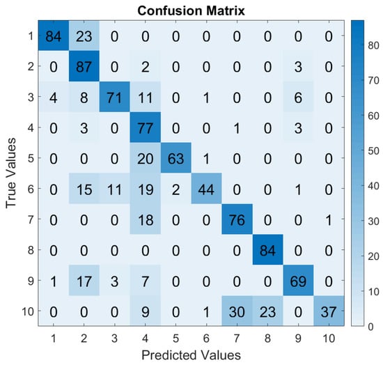 is the set of all possible linear maps from to . Each linear hypothesis represents a specific machine learning linear classification method. For a binary problem, the classification is performed on either side of the linear predictor map for a certain parameter vector . For multi-class classification, hyperplanes are added and therefore create subsections in the classification. In the present study, two linear methods were chosen: support vector machines (SVM) and multinominal logistic regression (MNLR). They have proven their good performance in the diagnosis of bearing faults [,,,].