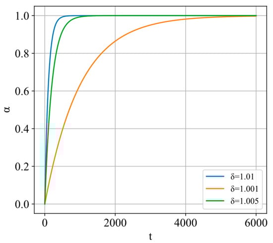 where is a constant. Figure 3 illustrates the curve of for different values of . It can be observed that a smaller value of leads to a smoother change in . Due to the adaptive adjustment of based on and , will actually fluctuate and rise with the increase in .
