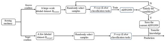 The proposed method in this paper addresses the issue of cross-condition few-shot bearing fault diagnosis. Let denote the dataset composed of known working condition data, and denote the dataset composed of target working condition data. contains a large number of labeled samples, while has only a limited number of labeled samples. The proposed method requires training on to acquire prior knowledge and subsequently utilizes the small number of labeled samples from to classify unlabeled samples within . Specifically, we need to construct numerous few-shot classification tasks on . Each few-shot classification task consists of a support set (a set of a few labeled samples) and a query set (a set of unlabeled samples). If a support set has N categories, each with K samples, the few-shot classification task is referred to as an N-way K-shot classification task. The model needs to learn how to both utilize a small number of labeled samples for classifying unlabeled samples in these few-shot classification tasks and apply the learned experience to .