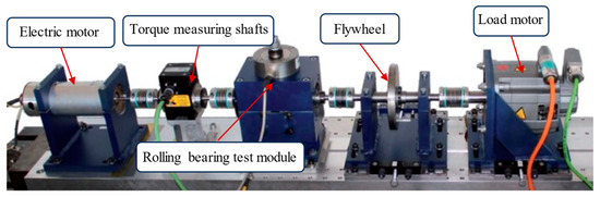 The PU dataset is collected on a modular experimental platform, as illustrated in Figure 6. This modular experimental platform consists of an electric motor, torque test shaft, rolling bearing test module, flywheel, and a load motor. By varying the speed of the drive system, the radial force on the bearing, and the load torque of the drive system, the PU dataset encompasses data from four working conditions. Table 2 provides detailed information on the three working conditions used in this study. The detailed parameters of the faulty bearings used in this study are presented in Table 3. The vibration signals used were measured via a piezoelectric accelerometer at the top adapter of the rolling bearing module, with a sampling frequency of 64 kHz and a signal length of 4096 for each sample.