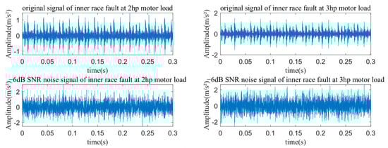where represents the power of the original signal, and represents the power of the signal with added noise. As the intensity of the added noise increases, the SNR decreases. Taking the example of the inner race fault under 1 hp conditions, Figure 8 illustrates the time-domain plots of the original vibration signal and the signal with added Gaussian white noise at −6 dB. It can be observed that after adding the noise, the fault features are obscured, significantly increasing the difficulty of fault diagnosis.