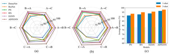 The accuracy of various models on the CWRU dataset. (a) The accuracy of each model under the 1-shot condition; (b) the accuracy of each model under the 3-shot condition; (c) comparison of average accuracy of few-shot learning models.
