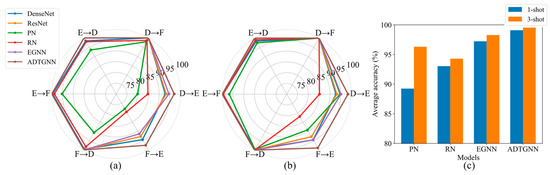 Table 6 and Figure 9 display the experimental results of various models on the CWRU dataset. In Table 6, A→B indicates that the model was trained on dataset A with a large number of labeled samples and tested on dataset B with only a few labeled samples. It can be seen that the accuracy of the proposed ADTGNN is consistently higher than that of other comparative models across six cross-condition fault diagnosis tasks. Under the 1-shot condition, ADTGNN achieves an average accuracy of 96.45%, surpassing EGNN by 2.83%. Under the 3-shot condition, ADTGNN demonstrates an average accuracy of 97.93%, exceeding EGNN by 2.26%. These findings highlight the superior performance of ADTGNN. From Figure 9c, it can be observed that the average accuracy of various few-shot learning models under 3-shot conditions is higher than that under 1-shot conditions. This is well understood, as the more samples each class has, the more information the model can learn about that class. Under the 1-shot condition, the average accuracies of DenseNet and ResNet are significantly lower than the other four few-shot learning models. Especially in the C→A task, the accuracy of DenseNet is only 85.12%, and ResNet achieves an accuracy of only 85.41%. The reason for this may be that traditional deep learning training strategies hinder the models from acquiring better general experience, making it challenging to handle fault diagnosis tasks across different operating conditions.
