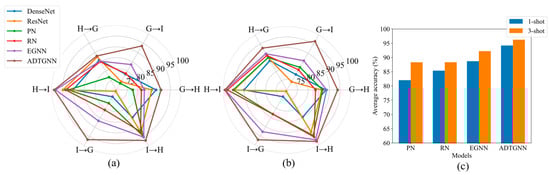 The accuracy of various models on the DDS dataset. (a) The accuracy of each model under the 1-shot condition; (b) the accuracy of each model under the 3-shot condition; (c) comparison of average accuracy of few-shot learning models.