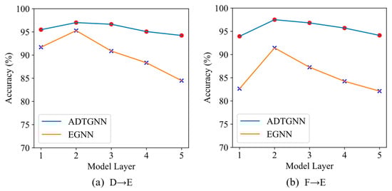 Chen et al. [35] proposed that the over-smoothing issue in GNNs may result from the excessive mixing of information and noise. In GNNs, interactions between nodes can bring useful information or irrelevant noise. For instance, interactions between nodes of the same class bring valuable information, making their representations closer to each other. Conversely, interactions between the nodes of different classes introduce noise, leading to learned representations that are indistinguishable. As the number of network layers increases, the acquired noise gradually outweighs the useful information, resulting in the over-smoothing problem. To validate the effectiveness of the proposed ATCM and DTAS in addressing over-smoothing issues, this study investigated the performance of EGNN and ADTGNN with different model layers in the challenging tasks of D→E and F→E. The experimental results under the 1-shot condition are presented in Table 9 and Figure 12.
