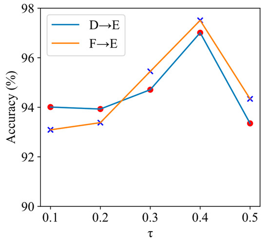In ADTGNN, a critical parameter, the global threshold , has a substantial impact on the model’s performance. The choice of τ directly affects the upper limit of the adaptive threshold learned by the model. To explore the performance of ADTGNN under different τ values, we conducted experiments under the 1-shot condition, focusing on the challenging tasks of D→E and F→E. In these experiments, ADTGNN had a model depth of two layers, and the value was set to 1.005. The results of the experiments are depicted in Table 10 and Figure 13.