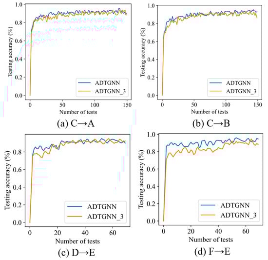 ADTGNN_1 indicates that the model does not use ATCM and DTAS. ADTGNN_2 indicates the model with a fixed threshold of 0.3 and without DTAS, while ADTGNN_3 indicates that the model only uses ATCM and not DTAS, with a τ value set to 0.4. The experimental results are presented in Table 11. It can be observed that ADTGNN_3 exhibits significantly higher accuracy across all four tasks compared to ADTGNN_2. This is attributed to the proposed ATCM, which adaptively sets thresholds for each edge based on confidence, reducing the likelihood of erroneously discarding important edges. To demonstrate the effectiveness of DTAS more distinctly, this paper plotted the testing accuracy curves for ADTGNN_3 and ADTGNN in a specific experiment in Figure 14. As seen in Figure 14, ADTGNN achieves higher accuracy more rapidly than ADTGNN_3, particularly in tasks C→A and F→E. This is because during the early stages of training, the model’s performance may be insufficient, and setting high thresholds could result in erroneously discarding useful edges, leading to training instability. DTAS, by constructing dynamic thresholds, effectively enhances training stability. Finally, it can be observed that ADTGNN_1 exhibits the poorest performance among the four models. In summary, we can conclude that both the proposed ATCM and DTAS contribute to the overall performance of the model and are indispensable.