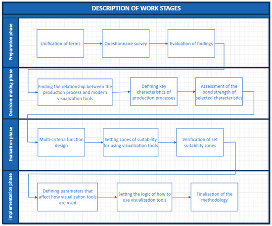 Although we have several types of modern visualization tools at our disposal, it is not always clear when these tools can be used for specific production processes in order to make the organizational preparation of production more efficient [55]. At the same time, the question of which type of visualization tools should be selected and possibly combined under predefined conditions is not answered [56]. In practice, then, it seems that companies are pushed into continuously rationalizing their production processes and deploying modern methods, techniques, and tools that are expected to help. However, we often see the opposite effect [57]. Enterprises deploy one of the modern visualization tools without knowing the main added value and limitations of this tool.