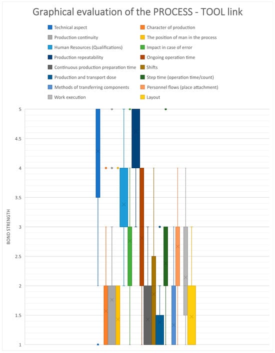 The existence of a dependency between the choice of visualisation tools for the creation of instructions within the organisational preparation of production and the nature of the production processes was assured. A Likert scale was used to find the relationship between the manufacturing process and modern visualization tools, which was modified by the author to fit the focus of the research. The individual characteristics of the manufacturing processes were then examined to determine the impact on the choice of visualization tools and the strength of the relationship. The identification of the key characteristics is the focus of the same chapter in which the research and statistical evaluation of the modified Likert scale output is conducted. The relevant characteristics of manufacturing processes with a strong link to the choice of visualisation tools are retrieved Figure 3 then evaluated and the results of the research can be seen.