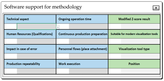 The above characteristics, based on the literature [60,61,62,63], will be investigated to determine the impact on the choice of visualization tools and the strength of the correlation. Developing a methodology for selecting a tool that optimally streamlines processes in preparation for production execution, differentiating usability and suitability based on external factors is sub-objective number 5. To this end, an evaluation form was developed.