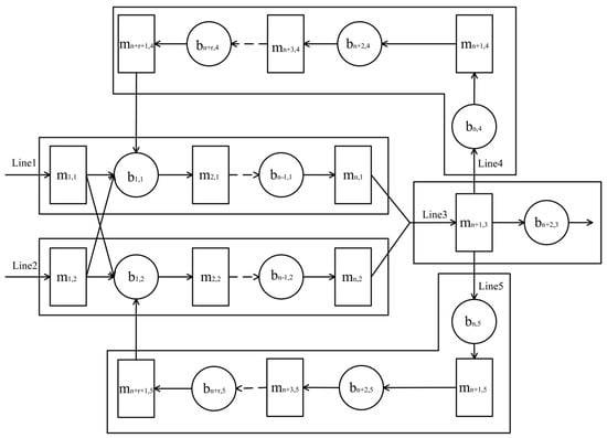 A permutation process model with re-entrant links has been established which can solve the problem of traditional tandem production lines. Figure 2 shows that the main production line and rework production line constitute the production system. In this system, denotes the processing machine; denotes the buffer of storage and transportation equipment (AGV). Moreover, parameter i, i = 1, 2, 3, …, n, means the computer or buffer index. The parameter j means the index of production lines. The parameters n and r mean another index number of machines (n, r ≥ 2). Three main production lines include Line1 (), Line2 (), and Line3 (), which can provide processing of parts for the end product. Parts can be transferred by AGV on the main production line Line4 () and Line5 () are called rework production lines; they can assist in reprocessing non-conforming parts on the main production line. If the probability of being non-faulty at any time is , then the probability of being faulty is . At any given moment, since the probability of failure for all busy machines is considered independent, the occurrence of a failure in one busy machine does not affect the probability of failures in other busy machines. If the number of tool types on the machine is , the number of parts to be processed is , the maximum inventory level of is , and C is the number of buffers. It is assumed that each machine in the permutation flowshop can process the same number of parts per unit time. If the amount of parts processed by each machine at the same time is the same, to reduce the difficulty of calculation, the number of parts is assumed to be 1. The total processing time is evenly divided into several sections according to the number of machines. Assuming the total processing time is M, the initial moment is expressed as t = 0, the end of the first moment is represented as t = 1, and the last moment is represented as t = M [].