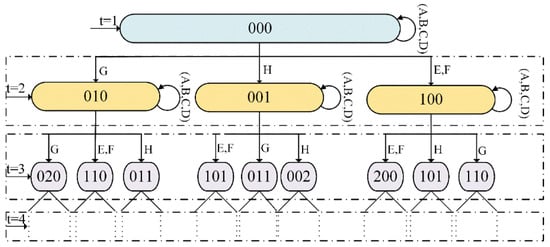 In Equation (6), represent the instantaneous occupancy of the buffer in the permutation flowshop at time t; represent the real-time occupancy of the buffer at time t − 1. represents the mapping relationship between transient states of three machine manufacturing systems during the period from t − 1 to t, as shown in Figure 4.