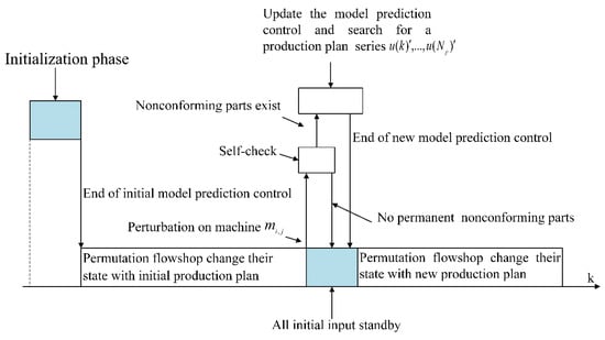Typically, model predictive control only performs the first control sample. After finishing the implementation of the first control sample, the model predictive control will restart with new system information. The job release time is dynamic and uncertain in permutation flowshop; production management will become increasingly difficult. For this reason, an r-WIP optimization approach is presented based on discrete event-driven predictive control. Figure 7 illustrates the implementation architecture of predictive control for the model. In Figure 7, the proposed model predictive control is divided into three steps. Because is a strictly lower triangular matrix with an appropriate number of transitions, a standard state–space model can be obtained by Equations (26) and (27). The and mean maximization and addition are, respectively, and .