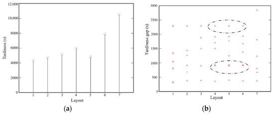 When assessing the efficacy of control strategies for permutation flowshop operations, it is important to consider not only the instantaneous state of the process Jin, but also the tracking error Jout of the reference signal. In Figure 8a, the tardiness values for layouts 1 to 7 are Y (700)-r (700) = 4261 s, 4725 s, 5125 s, 5944 s, 4958 s, 8027 s, and 10,669 s, respectively. Layout 1 can also achieve maximum throughput in the presence of non-conforming parts, but this can only be achieved by maintaining a high level of work-in-progress (WIP) buffering. In addition, the flexibility of event model predictive control (WIP) and discrete model predictive control (DMPC) in work-in-progress (WIP) is limited when machines are lacking or blocked. In Figure 8b, the circle represents the delay gap Jout (k + 1) − Jout (k) for different layouts. It can be seen from the results that when additional work is actively added in the unpredictable event, it is possible to increase the throughput of the sorting process by the event model prediction control and the discrete model prediction of the WIP. While DPM has similar output performance as WIP, it is not highly stable, as illustrated in Figure 8a of the drawing. In particular, r-WIP in discrete model predictive control of WIP is highly volatile, as illustrated in Figure 9b, which can add complexity to process management. On the other hand, WIP, an event model predictive control, is able to keep a constant WIP level through real-time adjustment of production schedule. Specifically, the r-WIP is very volatile in discrete model predictive control; as illustrated in Figure 9b, the complexity of process management may increase. On the contrary, if the production plan is adjusted in real time, event model predictive control of work-in-progress can maintain a constant level of it.