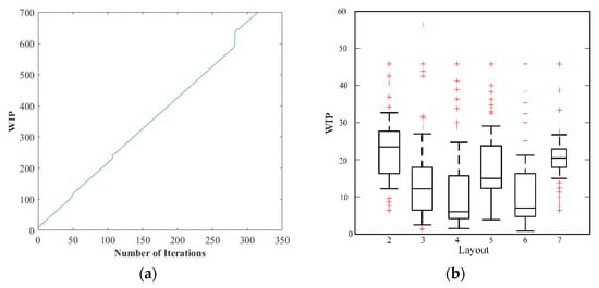 In Figure 9, we can observe the r-WIP metrics for seven distinct layouts. At each production step, r-WIP can be computed. Figure 9a illustrates that the r-WIP of the first layout exhibits a consistent linear increase alongside the production plan. Meanwhile, Figure 9b provides a graphical representation of the r-WIP for layouts 2 to 7 in a block diagram format, highlighting the fact that r-WIP values for other layouts remain below that of layout 2.