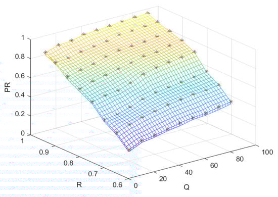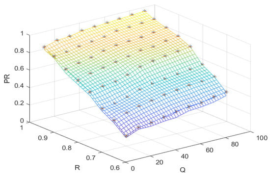 To further verify the effectiveness of the proposed method in practical cases, a simulation was carried out for the production process of flowshop layout 7, and the reliability (R) of the machine was the same, varying evenly from 0.6 to 1 at 0.1 intervals. All buffers have the same maximum inventory level , which increases evenly from 0 to 100. For all parameter settings, the productivity (PR) obtained by the method in this paper, the classical steady-state method [], and the traditional method are shown in Figure 10 and Figure 11.
