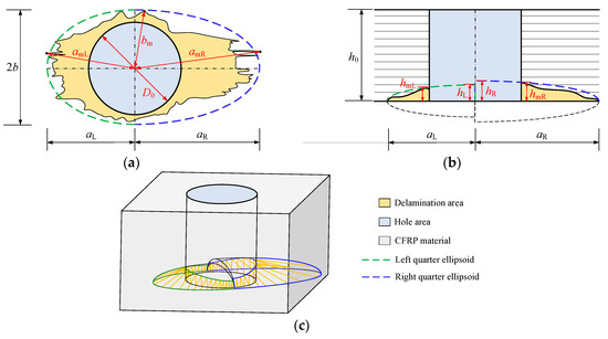 This paper proposes a three-dimensional volume delamination factor to simplify measurement and calculation while ensuring accurate assessment of the delamination damage to better meet engineering needs. In a single-layer plane composed of unidirectional fibers, delamination along the fiber direction is often more severe than that perpendicular to the fiber direction. Moreover, the delamination damage on either side of the hole along the fiber direction might differ. Two semi-ellipses are used to encompass the delamination zone, as shown in Figure 3a. The measured values amL, amR, and bm of the maximum distance from the edge of the delamination zone to the center of the hole are taken as the semi-major axis aL, aR, and the common semi-minor axis b of the two semi-ellipses, that is,