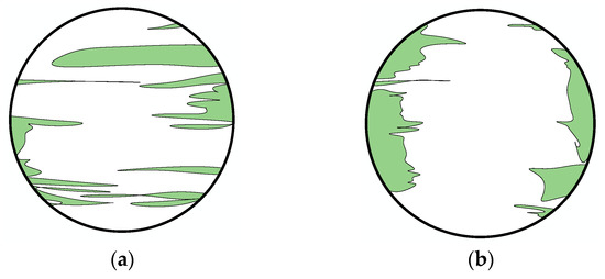 - The delamination area is not necessarily circular. Most of the articles are devoted to identifying an optimal circle to enclose the delamination region, using either the radius or area of the circle as measures of damage severity, as shown in Figure 1. For woven composites, treating the delamination region as a circle is reasonable because the single layer is quasi-isotropic. However, for laminates composed of unidirectional prepreg layers, due to the anisotropy of the single layer, the delamination on the exit side shows pronounced directivity. Specifically, the delamination along the fiber direction is more severe than that perpendicular to the fiber direction, as shown in Figure 2a. In this case, regarding the delamination region closer to the ellipse as a circle is inappropriate. This assertion finds support in the exit damage images of fibers of woven CFRP provided in [21,22] and the exit damage images of CFRP laminates composed of unidirectional prepreg layers provided in [26].