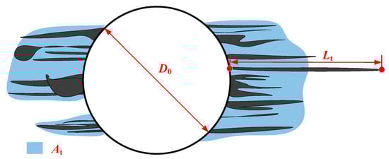 The evaluation method for tearing can refer to the burr factor and can be expressed as a two-dimensional tearing factor based on area. However, the damage shapes of the two are different, leading to a distinction in the calculation of the damage area. The burr area consists of a limited number of individual burrs within the hole, and there exists a distinct separation between the burrs, allowing for straightforward area measurement for each burr. Tearing, on the other hand, manifests as numerous slender linear segments within a confined zone, where the spaces between these thin linear segments are minimal. Consequently, measuring the area of each tearing segment is impractical, and relying on pixel counts based on binary images also makes it difficult to distinguish the boundaries of these thin linear tearing segments. According to the tearing damage shapes of different holes, specific zones encompassing the majority of localized fine linear tearing segments are manually designated, and the areas of the zones are calculated, as shown in the blue area in Figure 6. A length compensation coefficient is used to adjust the tearing factor for extremely long linear tearing segments extending beyond the zones. According to the principle that the tearing length should not exceed three times the hole diameter and the width should not surpass 1.8 mm, 3D0 × 1.8 is selected as the comparison benchmark for tearing damage [12,14]. The expression of the tearing factor Ft is