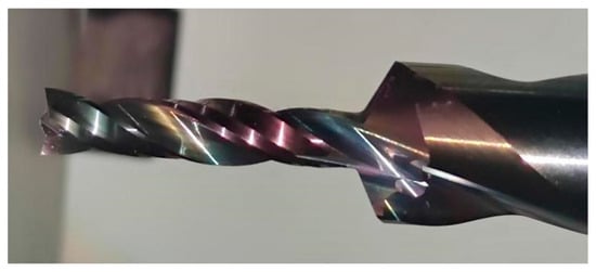 Based on the research results of the above articles, aiming to fulfill the requirements of practical engineering applications and minimize the interference of other variable factors, the brad-and-spur drill, with its high-quality drilling performance, was chosen as the cutting tool for the test. During the drilling process, as the tool approaches the hole’s exit, the two flank cutting edges cut off the fibers of the outermost layer along the hole’s edge, thus preventing tension among the fibers. Subsequently, the outermost layer of the material is pushed out when the main cutting edge penetrates the laminate. This cut–push effect proves effective in reducing drilling damage [48]. The material of the brad-and-spur drill for tests was carbide with CVD diamond coating, as shown in Figure 9. The diameter of the brad-and-spur drill was 4.18 mm.