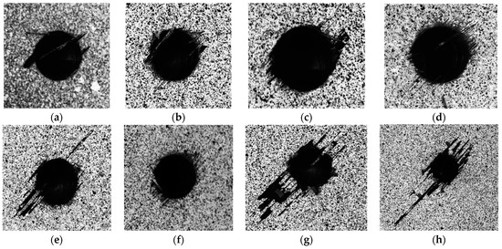 The surface morphologies on the exit sides of the holes in the second group are illustrated in Figure 16. It can be seen from the figure that the hole surface morphologies depicted in Figure 16e–h exhibit better characteristics compared to those in Figure 16a–d. The holes in Figure 16a,b appear as wide burrs and have poor roundness. The holes in Figure 16c,d display longer tearing lengths. Maintaining a constant feed rate, an increase in the spindle speed demonstrates an improvement in the hole’s exit side morphology.