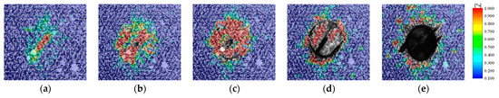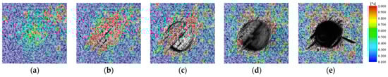 The variation trend for the strain distribution on the exit side of the hole at a spindle speed of 8000 rpm and a feed rate of 720 mm/min during drilling: (a) Stage 1; (b) Stage 2; (c) Stage 3; (d) Stage 4; (e) Stage 5.